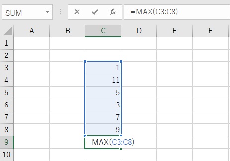 セル1で指定した「セルC3」からセル2で指定した「セルC8」までの数値を参照して最大値を求めます。